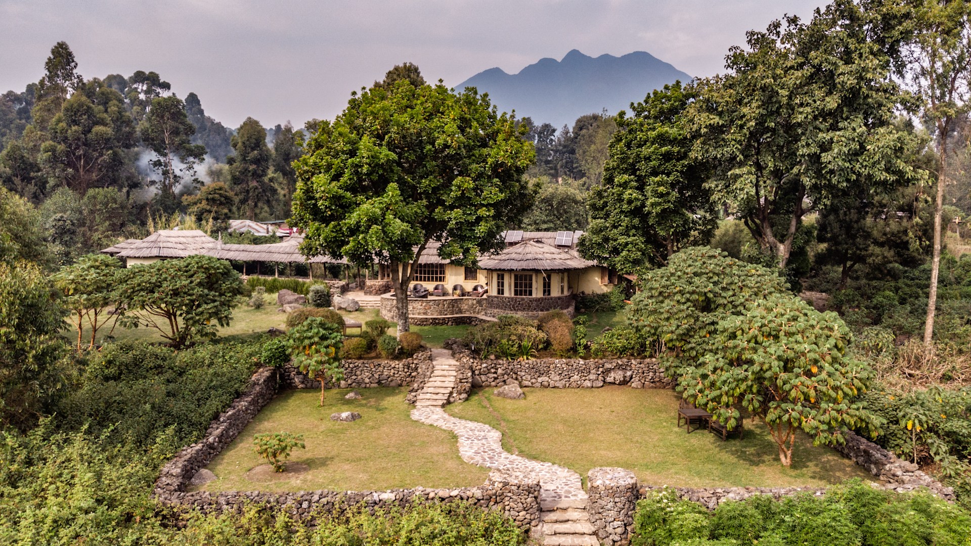 Elevated 7,000ft above sea level, gorilla country luxury with volcano views, forest mists, elegant cottages, and fire-lit mountain ambiance.