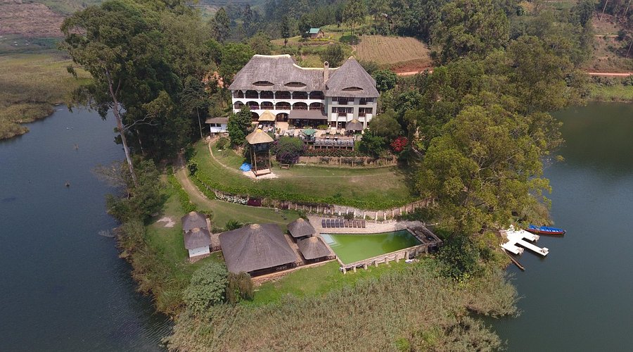 Perched on a volcanic crater lake shaped like Africa, offers sweeping Rwenzori vistas, misty mornings, sunsets, serene luxury.