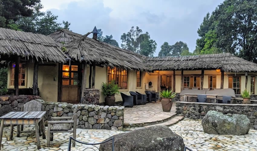The eight handcrafted stone-and-thatch bandas blend local Bufumbira traditions with modern elegance. Inside, you’ll find spacious rooms, ensuite bathrooms, and crackling fireplaces — while outside, private verandas open to spectacular views of the volcanoes and lush gardens.