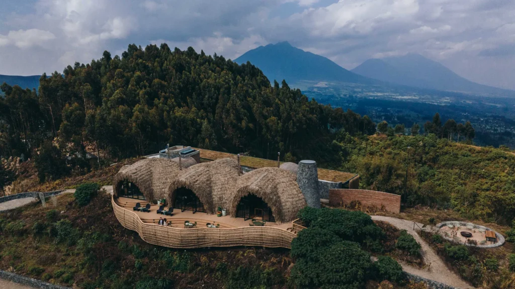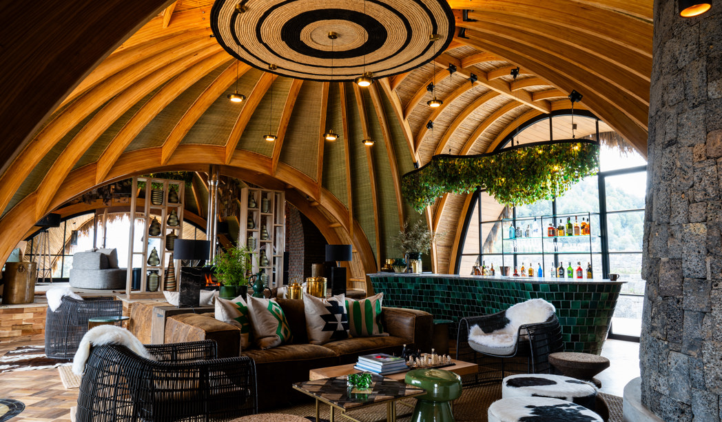 The lodge’s communal areas — including the elegant dining room, bar, and spa — blend handcrafted Rwandan textures with modern comforts, offering an inviting space to relax after a day of adventure.