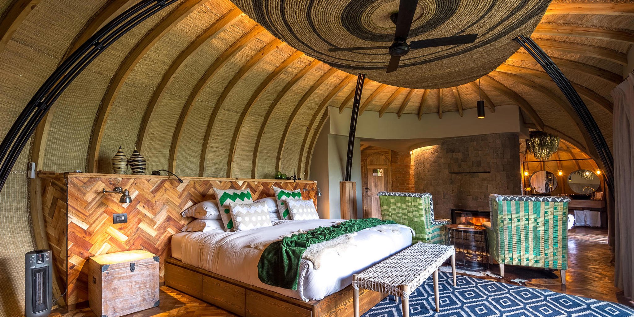 Set in the heart of Rwanda’s mountainous wilderness, Wilderness Bisate Lodge offers six striking forest villas designed to reflect the country’s cultural roots while honoring sustainable principles. Inspired by the traditional royal palaces of Rwanda, each villa features a spherical thatch-and-stone structure with a spacious bedroom, lounge, and bathroom — all warmed by a central fireplace. From your private deck, enjoy sweeping views of Mount Bisoke rising above the treetops.